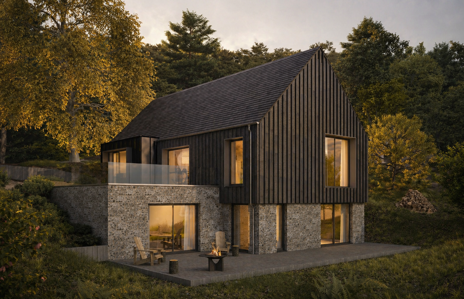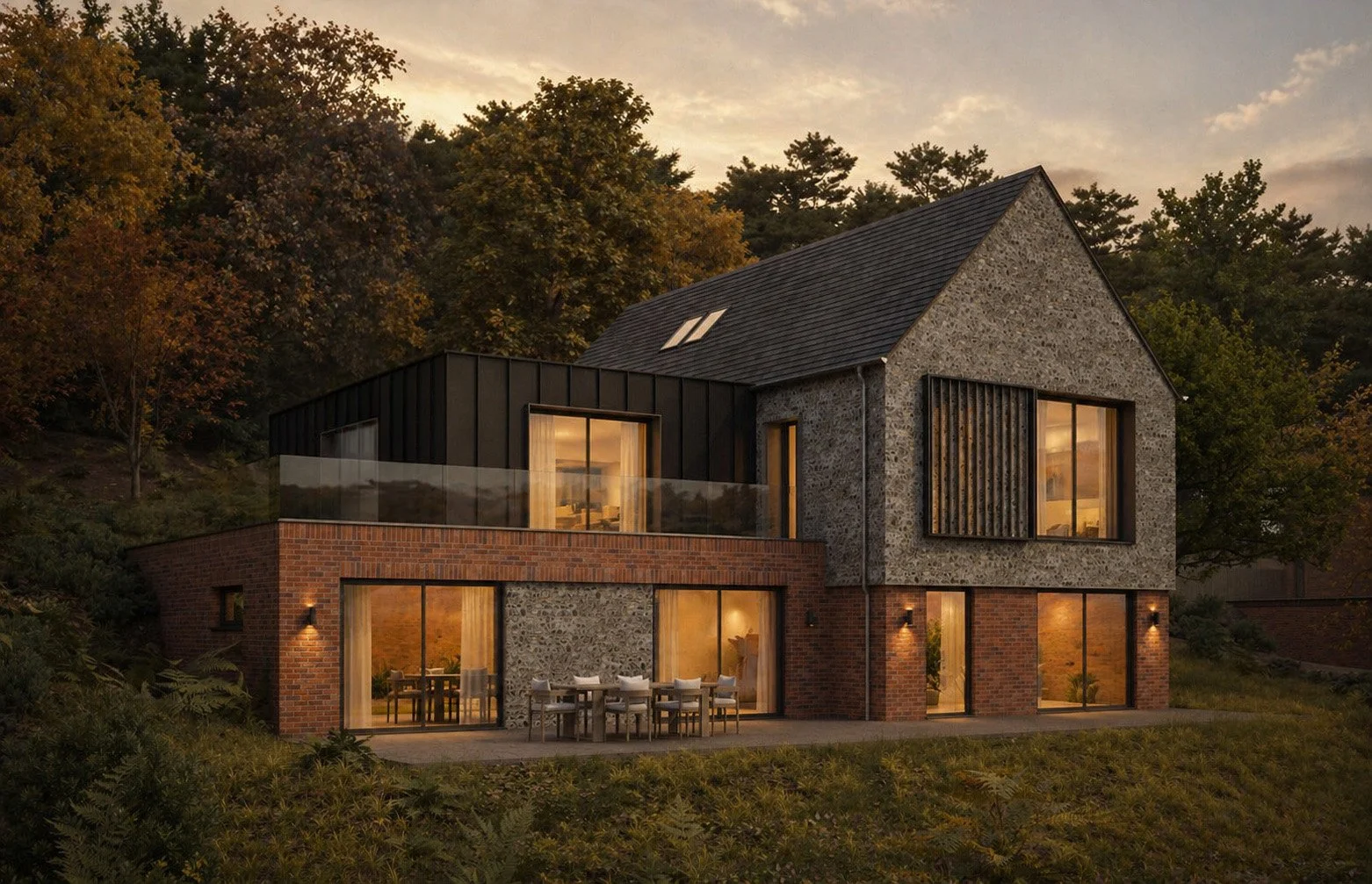 Each home is carefully placed within the natural slope, creating privacy, connection to the landscape and uninterrupted views across the countryside. Materials drawn from the local vernacular are reinterpreted with a contemporary precision, allowing the homes to feel both rooted and modern.